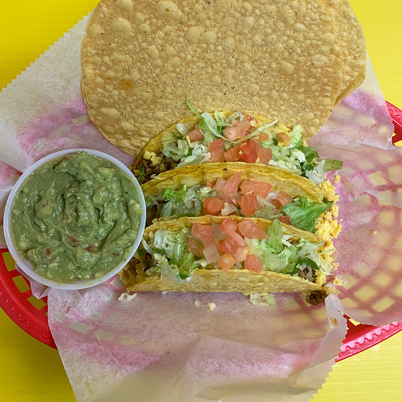 Two Meat Tacos, Bean Taco, Choice of Guacamole or “Queso” Dip, Two Crisp Tostadas