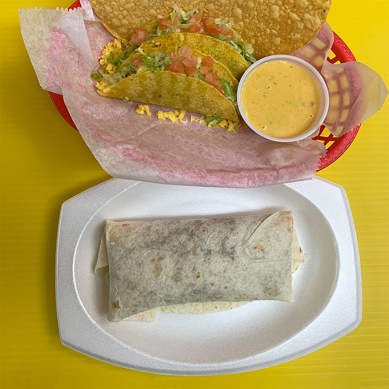 Burrito, Two Tacos, Choice of Guacamole or “Queso” Dip, Two Crisp Tostadas