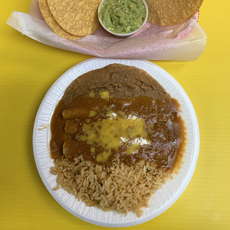 Three Enchiladas (Meat or Cheese or Chicken), Beans, Rice, Choice of Guacamole or “Queso” Dip, Four Crisp Tostadas