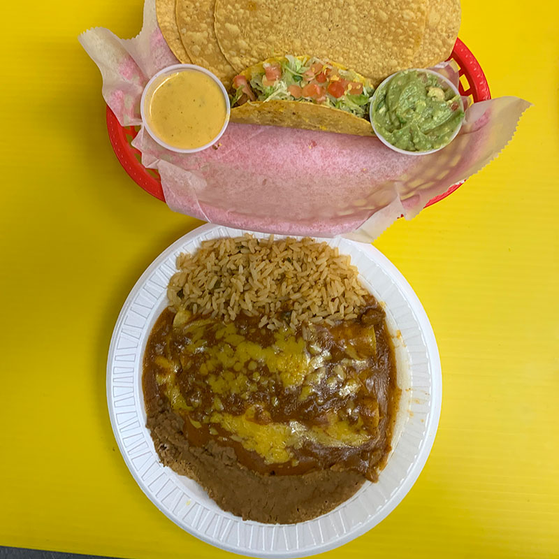 Two Cheese Enchiladas, One Meat Enchilada, Beans, Rice, Meat Taco, “Queso” Dip, Guacamole Dip, Four Crisp Tostadas
