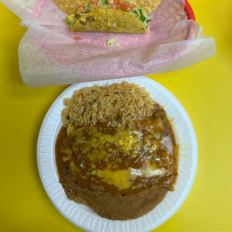 Two Cheese Enchiladas, One Meat Enchilada, Beans, Rice, Meat Taco, Two Crisp Tostadas